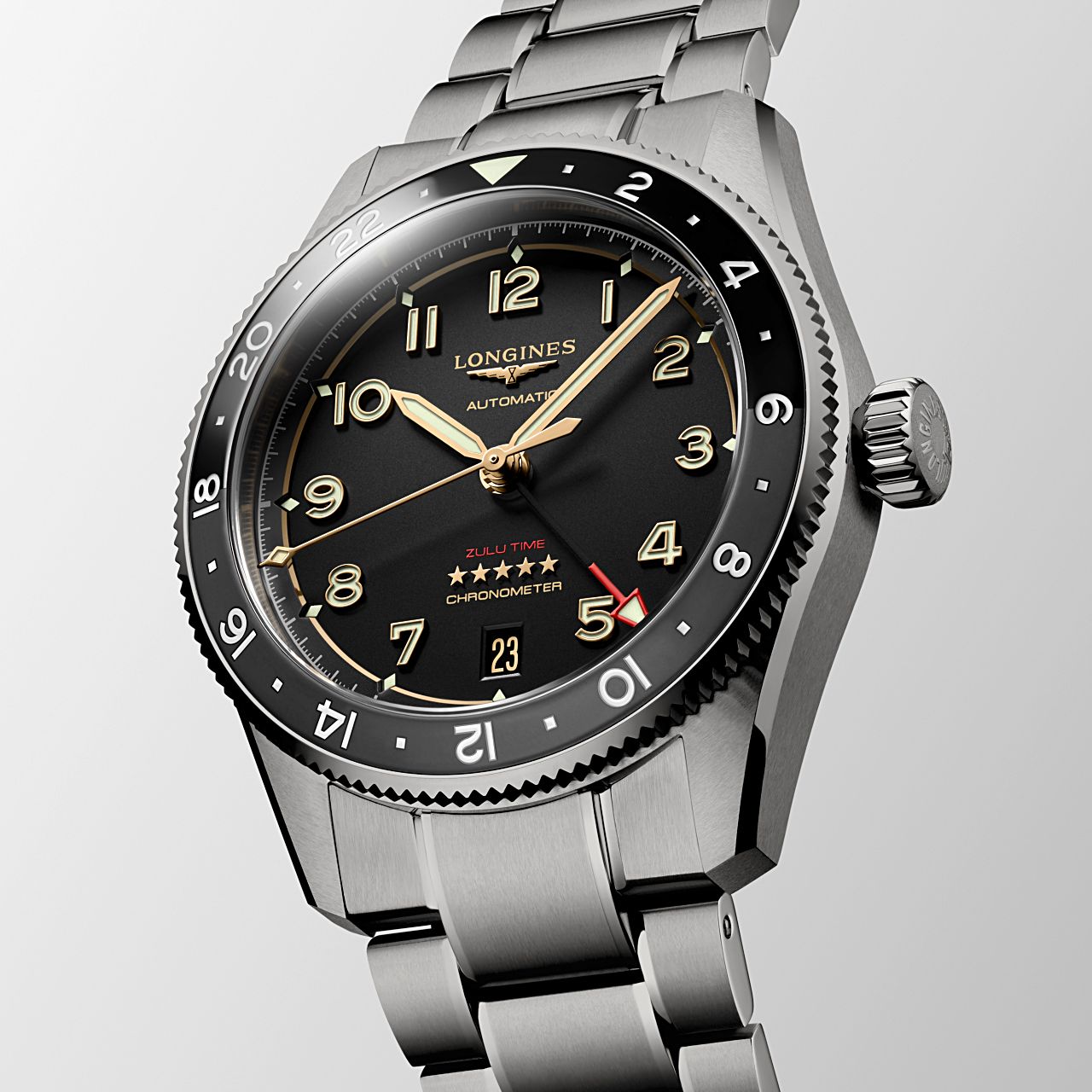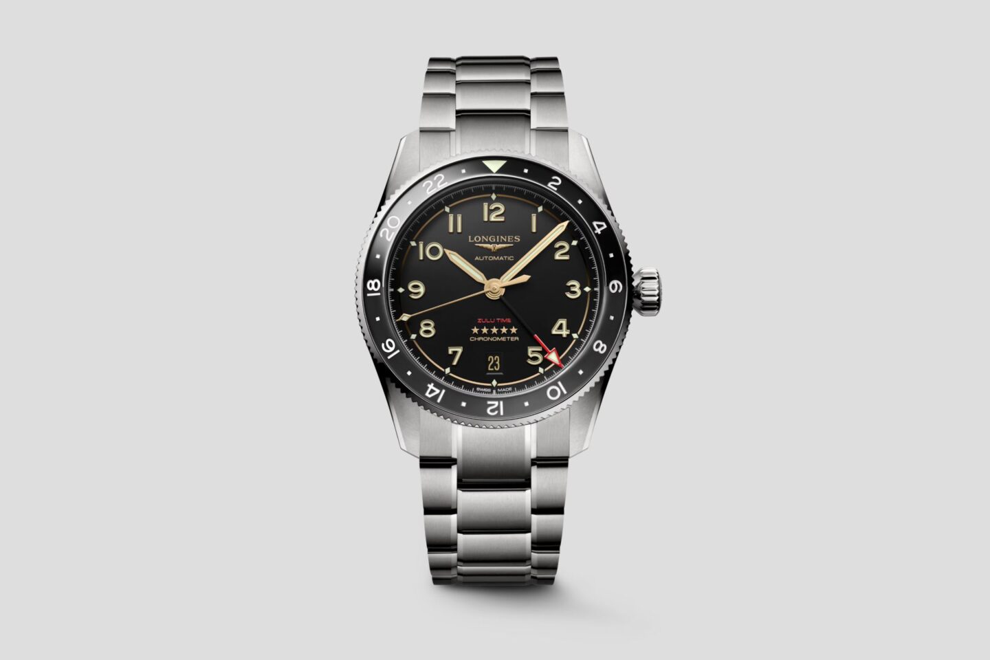 ในปีนี้ Longines เปิดตัวนาฬิการุ่นใหม่ล่าสุดจากคอลเลกชัน Spirit Zulu Time ตัวเรือนขนาด 42 มิลลิเมตร ที่เปิดตัวครั้งแรกในปี 2022 โดยได้รับชื่อมาจากนาฬิกาข้อมือที่สามารถบอกเวลาในแบบ 2 Time Zone เรือนแรกของ Longines ที่ผลิตขึ้นในปี 1925 ซึ่งโดดเด่นด้วยสัญลักษณ์ Z-Flag สีแดงบนหน้าปัด โดยมาจากคำว่า Zulu Time ที่หมายถึง เวลามาตรฐานโลกสำหรับการประสานงานทางทหารและการบิน ซึ่งเป็นเหมือนจุดเริ่มต้นของการพัฒนานาฬิกา GMT จาก Longines และตามมาด้วยรุ่น Spirit Zulu Time 39mm ในปี 2023 ที่ผ่านมา