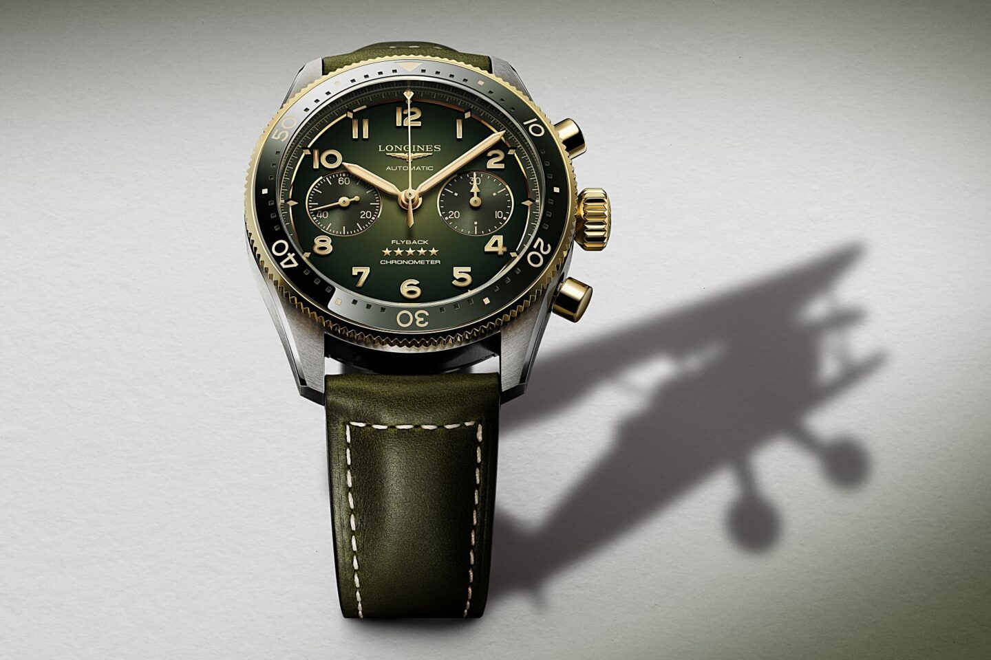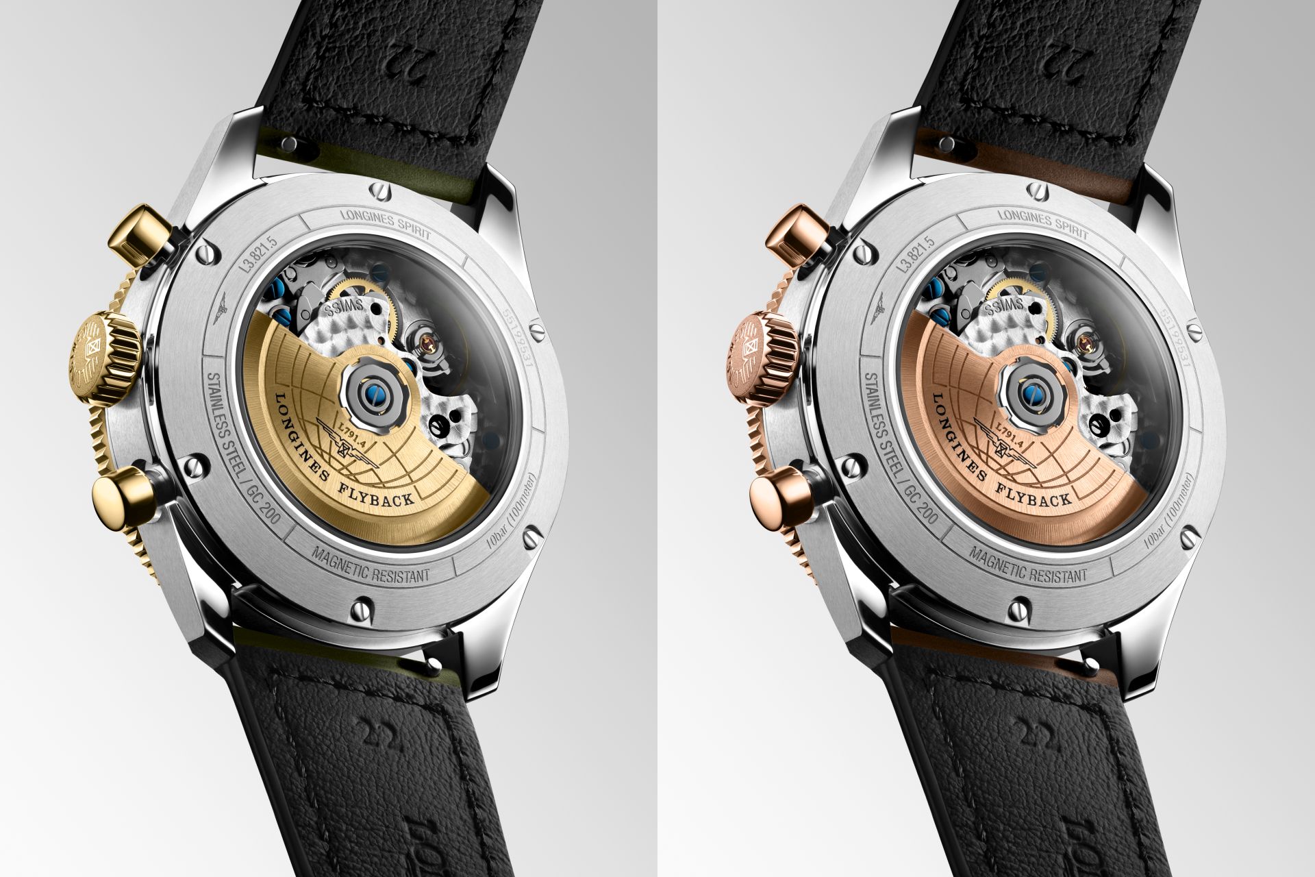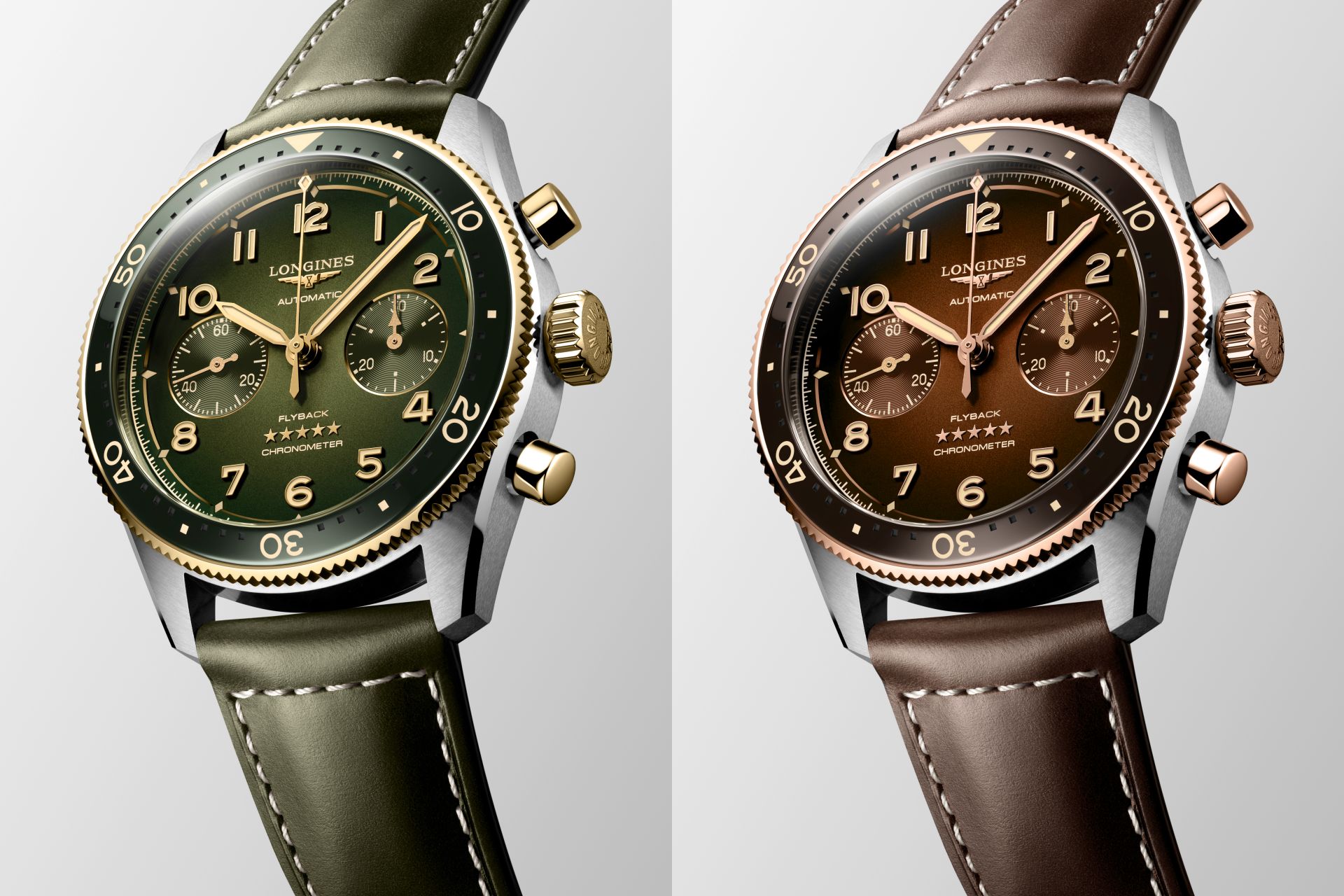 ปีนี้ Longines ได้เพิ่มสมาชิกใหม่ให้กับคอลเลกชัน Spirit Flyback เพื่อเป็นทางเลือกสำหรับนักสะสมที่ชื่นชอบนาฬิกาแนวสปอร์ตหรู ด้วยการเพิ่มรุ่น 2 Tone ที่ใช้วัสดุ Yellow Gold 18K ตรงเม็ดมะยมและปุ่มกดจับเวลา ในรุ่นหน้าปัดสีเขียว และวัสดุ Pink Gold 18K ในรุ่นหน้าปัดสีน้ำตาล ซึ่งเป็นโทนสีเดียวกับขอบหน้าปัดย่อยแบบ Bi-Compax ชุดเข็มบอกเวลาและหลักชั่วโมง รวมทั้งขอบ Bezel แบบหมุนได้สองทิศทางพร้อม 60 minute Scale Insert วัสดุ Ceramic สีเดียวกับหน้าปัด ใช้กระจกหน้าปัด Sapphire เคลือบตัดแสงสะท้อนทั้งสองด้าน และมาพร้อมกับสายหนังโทนสีเดียวกับหน้าปัดเย็บด้วยด้ายสีขาวกับ Folding Buckle Steel พร้อมระบบล็อก 2 ชั้น