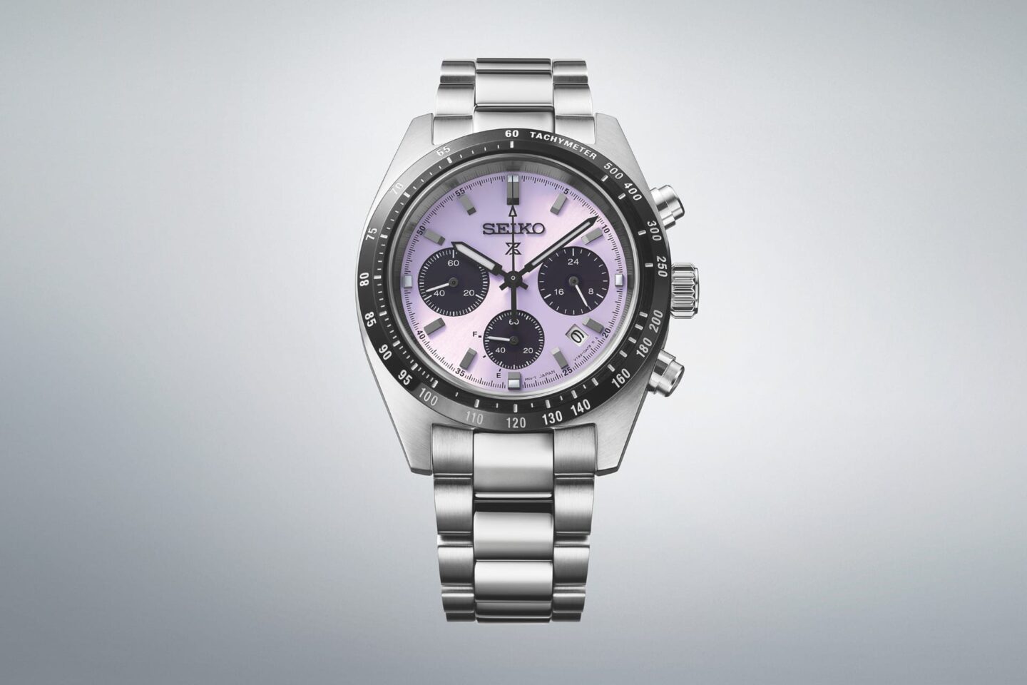 นาฬิกา Seiko Prospex SPEEDTIMER Solar Chronograph Limited Edition โดดเด่นด้วยหน้าปัดสีม่วง “Edo Purple” หรือสีม่วงอ่อนที่เคยได้รับความนิยมอย่างสูงในเมืองหลวงสมัยโบราณยุคเอโดะ ซึ่งต่อมากลายเป็นกรุงโตเกียวในปัจจุบัน เข็มจับเวลาโครโนกราฟที่ทำงานร่วมกับขอบหน้าปัดพร้อมสเกล Tachymeter สีดำเพื่อบ่งบอกความเร็วเฉลี่ยในการเคลื่อนที่ หลักชั่่วโมงและเข็มนาฬิกาเคลือบสารเรืองแสง Lumibrite หน้าปัดย่อยสีดำสำหรับแสดงวินาที เวลา 24 ชั่วโมง และตัวจับเวลา 60 นาที แบบ tri-compax มีหน้าต่างบอกวันที่ตรงตำแหน่ง 4.30 นาฬิกา ใช้กระจกหน้าปัดแซฟไฟร์แบบโค้งเคลือบตัดสะท้อนแสงภายใน