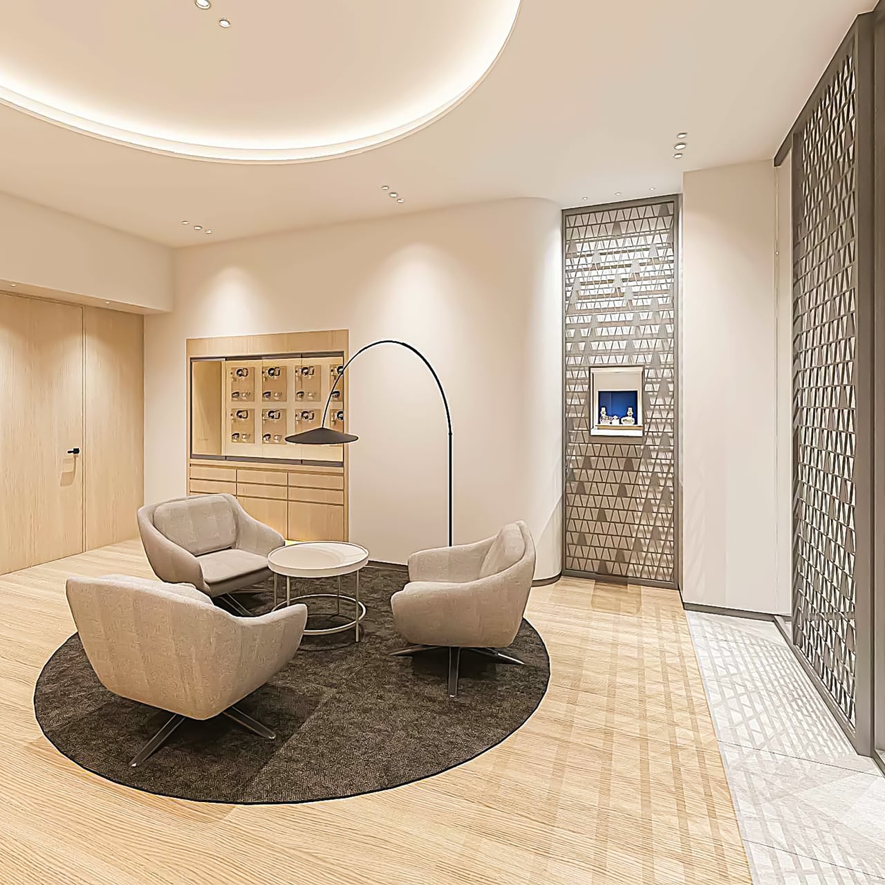 การตกแต่งภายในของบูติกแห่งใหม่นี้ผสมผสานความงามร่วมสมัยเข้ากับแรงบันดาลใจจากงานฝีมือญี่ปุ่นแบบดั้งเดิมอย่างกลมกลืน ไม่ว่าจะเป็นการเลือกใช้โทนสีเรียบหรู การจัดแสงให้ดูสบายตา และพื้นผิวไม้สีอ่อน ที่ช่วยสร้างบรรยากาศที่สงบและน่ารื่นรมย์ ฉากกั้นโปร่งแสงถูกติดตั้งเพื่อจัดแยกพื้นที่สำหรับชมนาฬิกาและพื้นที่จัดแสดงบริเวณด้านหน้าอย่างเป็นสัดส่วน เพื่อให้ผู้ที่มาเยือนได้รับชมนาฬิกาในบรรยากาศที่เป็นส่วนตัว ดีไซน์ของฉากกั้นเหล่านี้ได้แรงบันดาลใจจาก Kumiko เทคนิคงานไม้อันเก่าแก่ของญี่ปุ่นที่ช่างฝีมือจะใช้แผ่นไม้ประกอบขึ้นเป็นลวดลายตารางอย่างประณีตโดยไม่ใช้ตะปู สะท้อนจิตวิญญาณของแบรนด์ที่เคารพในศิลปะชั้นสูงที่ต้องอาศัยทักษะความเชี่ยวชาญของช่างศิลป์ โลโก้ของแบรนด์บนผนังสีน้ำเงินอันเป็นเอกลักษณ์ ช่วยเติมเต็มบรรยากาศ พื้นที่ส่วนจัดแสดงทรงกลมที่กึ่งกลางของพื้นที่ร้าน รายล้อมด้วยมุมที่จัดสรรให้เป็นพื้นที่ต้อนรับ และเชื้อเชิญให้ผู้มาเยือนได้รับชมเรือนเวลา คอลเลกชันต่างๆ ได้ตามอัธยาศัย