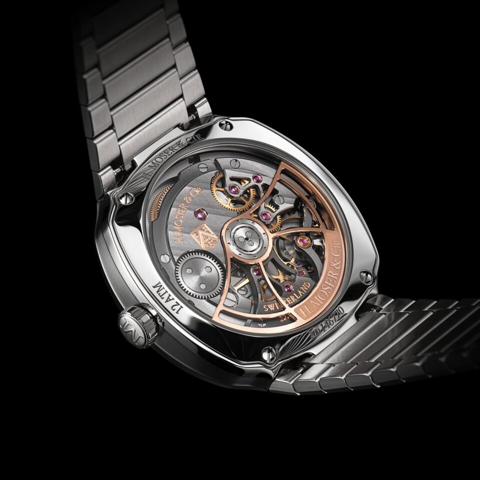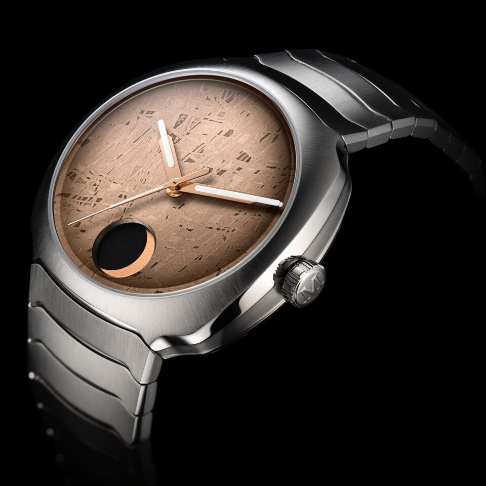 ย้อนกลับไปในปี 2020 H. Moser & Cie. ได้เปิดตัวคอลเลกชัน Streamliner ซึ่งเป็นนาฬิกาสปอร์ตหรูหราที่มาพร้อมกับตัวเรือนรูปทรงเพรียวบางและสายนาฬิกาแบบผสานเข้ากับตัวเรือนได้อย่างแนบเนียน โดยเริ่มจากรุ่น Flyback Chronograph ชื่อรุ่นนี้ได้รับแรงบันดาลใจมาจากยุค Streamliner Moderne ในช่วงทศวรรษ 1920-1930 ซึ่งเป็นการเฉลิมฉลองเครื่องจักรยุคใหม่ที่เน้นการออกแบบตามหลักอากาศพลศาสตร์ที่ลื่นไหลและโฉบเฉี่ยว เช่นเดียวกับรถไฟ เรือเดินสมุทร และเครื่องบิน แม้ว่า Streamliner จะเป็นรุ่นใหม่ แต่ H. Moser & Cie. มีความเชี่ยวชาญในการสร้างสรรค์กลไกข้างขึ้นข้างแรมอยู่แล้ว โดยเคยปรากฏในรุ่น Endeavour หลายรุ่น เช่น Endeavour Perpetual Moon Vantablack ที่โด่งดัง และล่าสุดนี้ ทางแบรนด์ได้ผสานความซับซ้อนแม่นยำสูงเข้ากับดีไซน์อันเป็นเอกลักษณ์ในรุ่น Streamliner Perpetual Moon Concept Meteorite ซึ่งเปิดตัวในงาน Dubai Watch Week 2025
