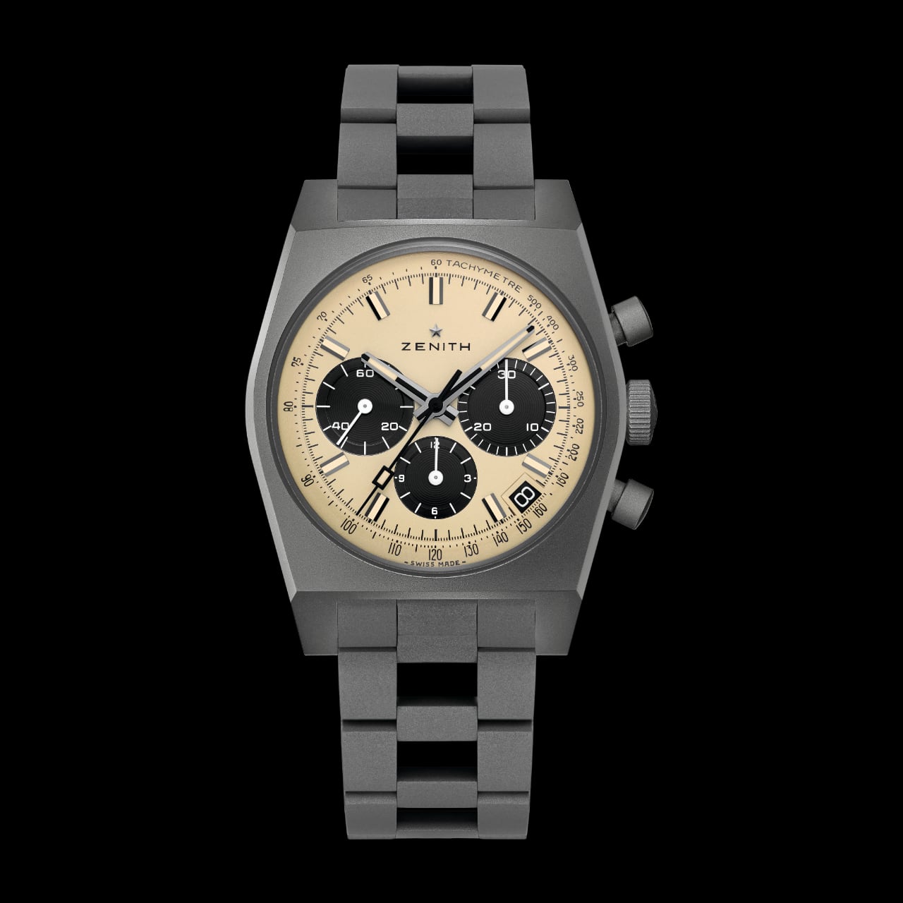 หน้าปัดสี Beige โดดเด่นด้วย Black Chronograph Counters และ Tachymeter Scale สร้างสรรค์ให้มีอารมณ์แบบวินเทจ ส่วนเข็มและหลักชั่วโมงเป็นแบบ Ruthenium-plated เคลือบด้วย Super-LumiNova® SLN สี Beige เพื่อให้เรืองแสงได้ในที่มืด ฟังก์ชันที่แสดงผลบนหน้าปัดประกอบด้วย ชั่วโมง, นาที, วินาที, เข็ม Chronograph และวันที่ตรงตำแหน่ง 4.30 นาฬิกา ใช้กระจกหน้าปัดเป็น Sapphire โดยนาฬิกาจับคู่มากับสาย Ladder Bracelet ที่เป็นเอกลักษณ์ ซึ่งออกแบบโดย Gay Frères ในปี 1969 สำหรับ ZENITH โดยเฉพาะ สาย Ladder ในรุ่นใหม่นี้ทำจาก Microblasted Titanium เพื่อให้เข้ากับตัวเรือนและมอบความรู้สึกเบาสบาย พร้อมตัวล็อกแบบ Folding