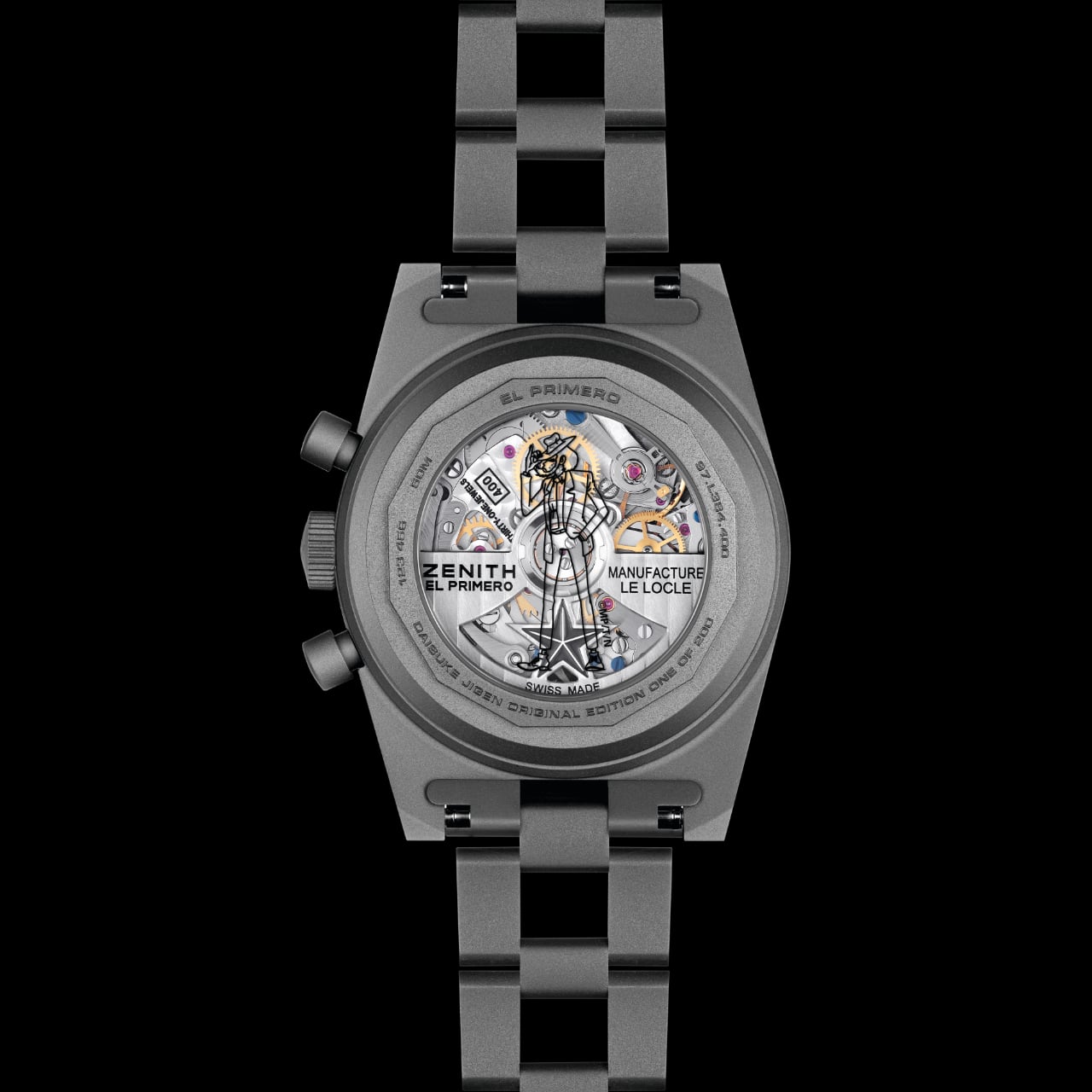ตัวเรือนขนาด 37 มิลลิเมตร ผลิตจาก Microblasted Titanium ซึ่งเป็นโลหะที่น้ำหนักเบาแต่ทนทาน มีพื้นผิวแบบ Matte ให้สีเทาเข้ม ระดับการกันน้ำอยู่ที่ 50 เมตร ตัวเรือนเป็นรูปทรง Tonneau อันเป็นเอกลักษณ์ของรุ่น A384 ภายในขับเคลื่อนด้วยกลไก El Primero 400 ซึ่งเป็นกลไก In-house ที่พัฒนาและผลิตโดย ZENITH และเป็นทายาทโดยตรงของกลไก El Primero ในปี 1969 เป็นกลไก Chronograph แบบ Automatic ที่มีความถี่สูง 36,000 ครั้งต่อชั่วโมง (5 Hz) ให้ความเที่ยงตรงระดับ 1/10 วินาที และมีพลังงานสำรอง 50 ชั่วโมง โดยกลไกประกอบด้วยชิ้นส่วนกว่า 300 ชิ้น สามารถชื่นชมความซับซ้อนและการขัดแต่งที่ละเอียดได้ผ่านฝาหลังกระจก Sapphire ซึ่งมีการสลักลวดลาย Silhouette ของ Daisuke Jigen ไว้อย่างชัดเจน