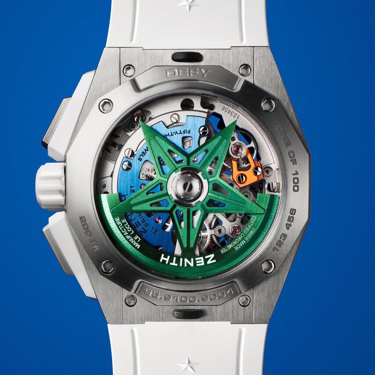 ตัวเรือนขนาด 45 มิลลิเมตร หนา 15.4 มิลลิเมตร ผลิตจากวัสดุ Titanium ซึ่งมีให้เลือก 2 รูปแบบ คือ Titanium กับ Black Ceramic หรือ Titanium กับ White Ceramic ขอบหน้าปัดทรงสิบสองเหลี่ยม มีระดับการกันน้ำ 200 เมตร กลไกภายใน Calibre El Primero 9004 ซึ่งเป็นกลไกไขลานอัตโนมัติแบบ In-house ที่ได้รับการรับรองโครโนมิเตอร์โดย TimeLab ซึ่งถูกสร้างขึ้นด้วยเทคนิคสมัยใหม่ของ Zenith ด้วยการใช้ชุด Escapement คู่: ชุดแรกสำหรับกลไกบอกเวลาทั่วไป ทำงานที่ความถี่ 36,000 ครั้งต่อชั่วโมง (5Hz) และชุดที่สองสำหรับกลไกโครโนกราฟ ทำงานที่ความถี่สูงถึง 360,000 ครั้งต่อชั่วโมง (5Hz) ทำให้สามารถจับเวลาเวลาได้ละเอียดถึง 1/100 ของวินาที สำรองพลังงาน 50 ชั่วโมง สำหรับการบอกเวลาปกติ และ 50 นาที สำหรับโครโนกราฟ กลไกนี้โดดเด่นด้วยการขัดแต่งบริดจ์ที่เคลือบด้วย PVD “สีรุ้ง” พร้อมด้วยโรเตอร์ที่มีสีสันพิเศษเพื่อความสวยงาม สายนาฬิกามาพร้อมระบบเปลี่ยนเร็วใน 3 รูปแบบ ได้แก่ สายยาง, สาย Titanium และสาย Velcro สีดำพร้อมตัวล็อกสายแบบบานพับ