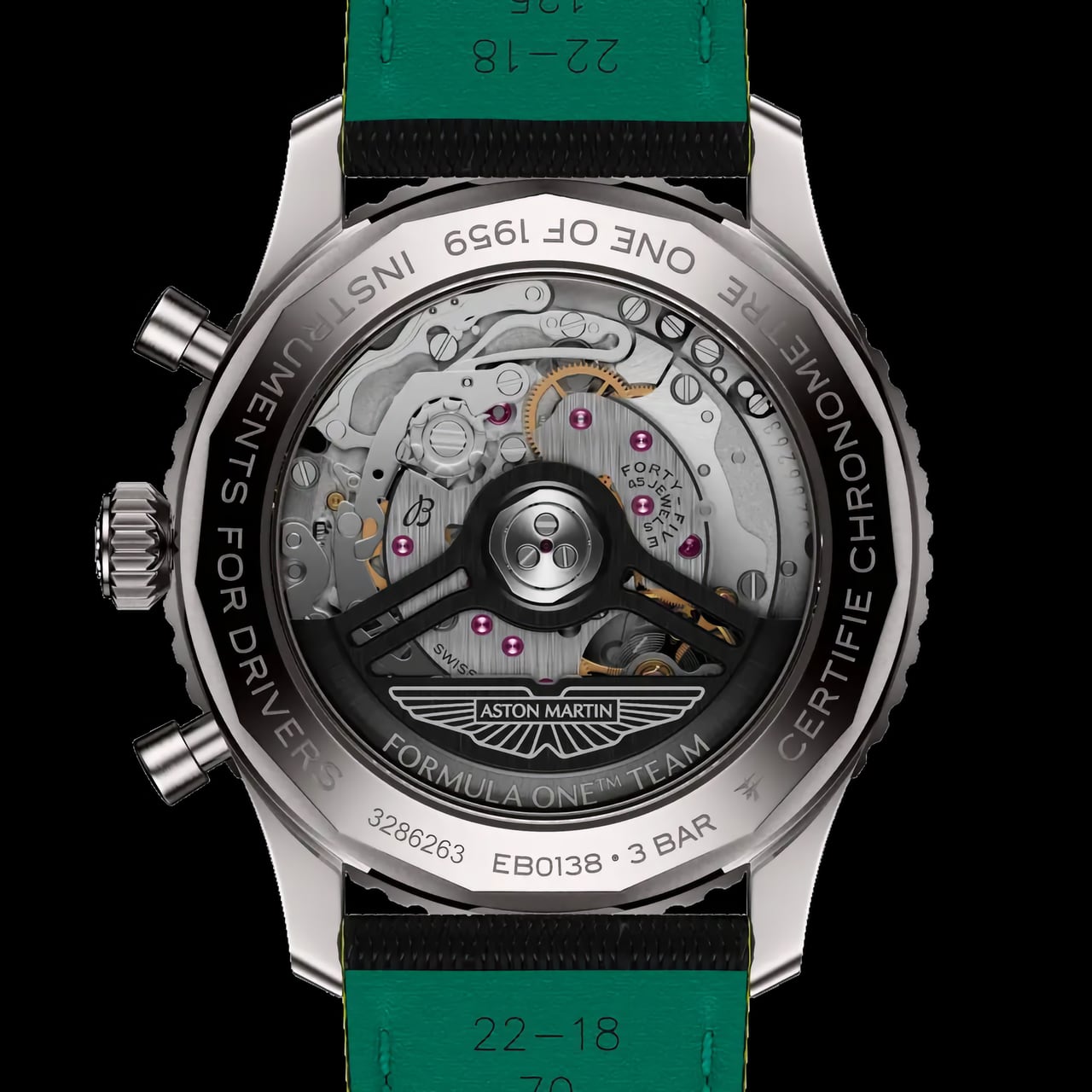 ตัวเรือนขนาด 43 มิลลิเมตร หนา 13.69 มิลลิเมตร ผลิตจากวัสดุ Titanium เกรดพิเศษ ซึ่งถือเป็นครั้งแรกของคอลเลกชัน Navitimer ที่ใช้วัสดุชนิดนี้เพื่อให้มีน้ำหนักเบาและทนทานสูง โดยสามารถกันน้ำได้ที่ระดับ 30 เมตร ตัวเรือนคงเอกลักษณ์ด้วยขอบตัวเรือนหมุนได้สองทิศทาง พร้อม Circular Slide Rule ปุ่มกดจับเวลาทรงลูกสูบและเม็ดมะยมแบบไม่ขันเกลียวพร้อมโอริง 2 ชั้น ภายในขับเคลื่อนด้วยกลไกไขลานอัตโนมัติแบบ In-house Calibre B01 ทำงานด้วยความถี่ 28,800 ครั้งต่อชั่วโมง (4Hz) ให้พลังงานสำรองนานถึง 70 ชั่วโมง ผ่านมาตรฐานความเที่ยงตรงระดับ COSC โดยมองเห็นผ่านฝาหลัง Sapphire ที่เผยให้เห็นการขัดแต่งกลไกอย่างประณีตและโรเตอร์ที่สลักโลโก้ทีม Aston Martin Aramco F1 มาพร้อมกับสายนาฬิกาวัสดุหนังลูกวัวสีดำเย็บตะเข็บสีเขียว พร้อมตัวล็อกสายแบบ บานพับวัสดุ Titanium