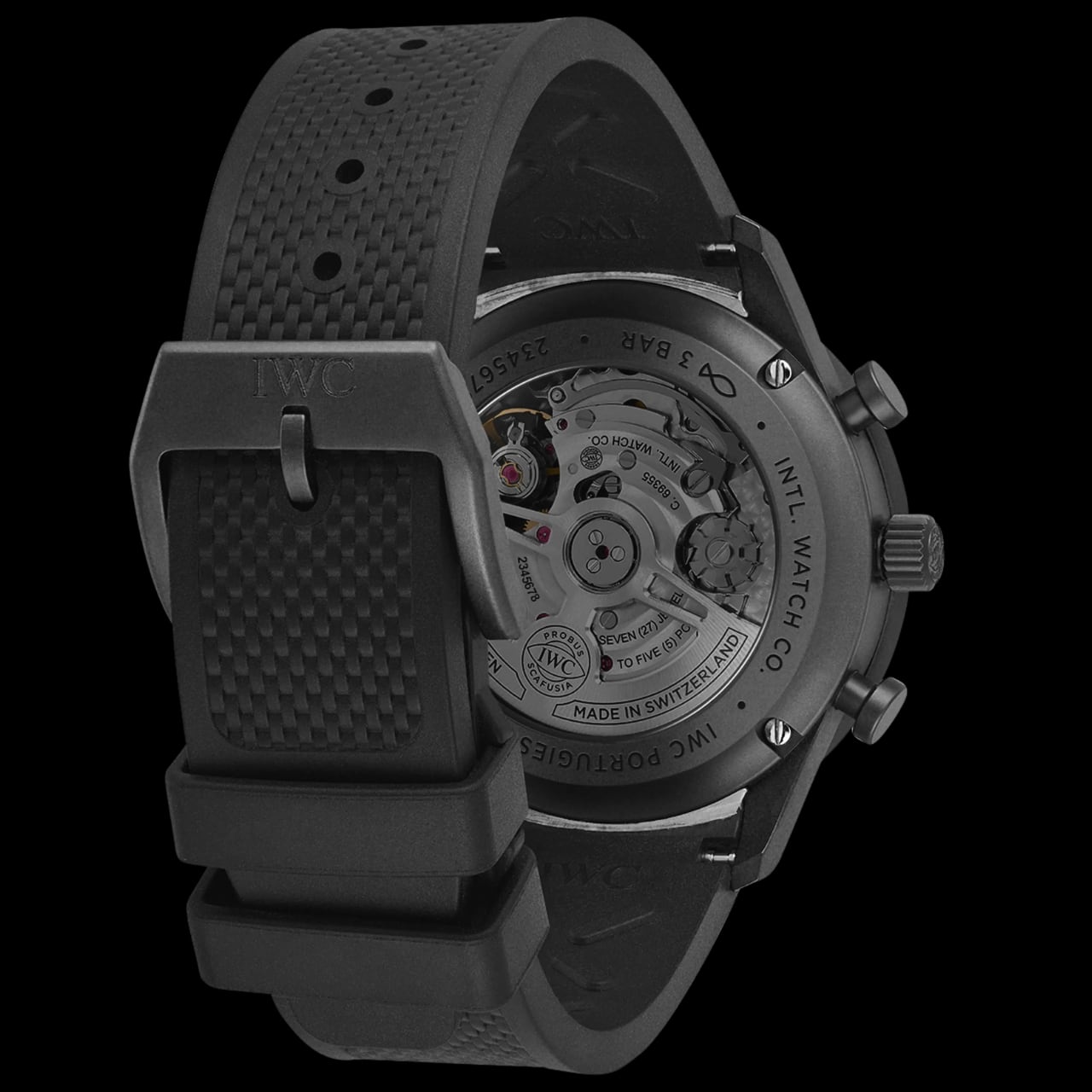 ตัวเรือนขนาด 41 มิลลิเมตร หนา 13.1 มิลลิเมตร ผลิตจากวัสดุ Ceratanium® ซึ่งเป็นวัสดุลิขสิทธิ์เฉพาะของ IWC ที่ผสมผสานความน้ำหนักเบาและทนทานของ Titanium เข้ากับความแข็งแกร่งและป้องกันรอยขีดข่วนของ โดยตัวเรือน เม็ดมะยม และปุ่มกดทรงเห็ด ล้วนมีพื้นผิวสีดำด้านจากการผ่านกระบวนการเผาในเตาหลอมอุณหภูมิสูง มีระดับการกันน้ำที่ 30 เมตร ด้านฝาหลังเป็นแบบเปลือยด้วยกระจก Sapphire รมดำ sapphire เผยให้เห็นกลไกระบบไขลานอัตโนมัติ Calibre 69355 ซึ่งเป็นกลไก Chronograph แบบ Column wheel ที่แม่นยำ ทำงานด้วยความถี่ 28,800 ครั้งต่อชั่วโมง (4Hz) ให้พลังงานสำรองนานถึง 46 ชั่วโมง ตัวกลไกมีการขัดแต่งอย่างประณีต มาพร้อมกับสายยางคุณภาพสูงสีดำพร้อมลวดลายกับหัวเข็มขัดสายที่ทำจากวัสดุ Ceratanium®