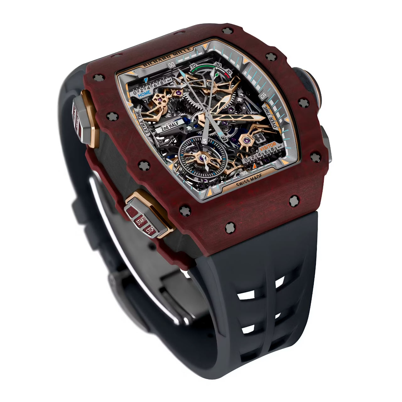 หน้าปัดถูกออกแบบมาในสไตล์ Skeletonized ที่เผยให้เห็นความซับซ้อนของกลไกภายในอย่างชัดเจน มาพร้อมเข็มชั่วโมงและนาทีที่มีพรายน้ำช่วยในการอ่านค่าในที่มืด จุดเด่นที่สุดคือหน้าปัดที่แบ่งสเกลสำหรับการแข่งขันฟุตบอลโดยเฉพาะ ประกอบด้วยการจับเวลา 2 ครึ่งเวลา ครึ่งละ 45 นาที พร้อมส่วนแสดงเวลาบาดเจ็บหรือช่วงต่อเวลาพิเศษสูงสุด 15 นาที แสดงผลผ่านเข็มจับเวลาวินาทีสีส้มที่ติดตั้งอยู่กึ่งกลาง กระจกหน้าปัดผลิตจากแซฟไฟร์ที่มีความแข็งแกร่งระดับ 1,800 Vickers พร้อมเคลือบสารกันสะท้อนทั้งสองด้าน ตัวเรือนทรงถังเบียร์อันเป็นเอกลักษณ์ 43.23 มิลลิเมตร ยาว 49.65 มิลลิเมตร และหนา 16.08 มิลลิเมตร ผลิตจากวัสดุ Red Carmin Basalt TPT® และ Dark Blue Quartz TPT® ตัวแกนกลางที่ผลิตจาก Titanium เคลือบสีดำเช่นเดียวกัน โดยสามารถกันน้ำได้ในระดับ 50 เมตร