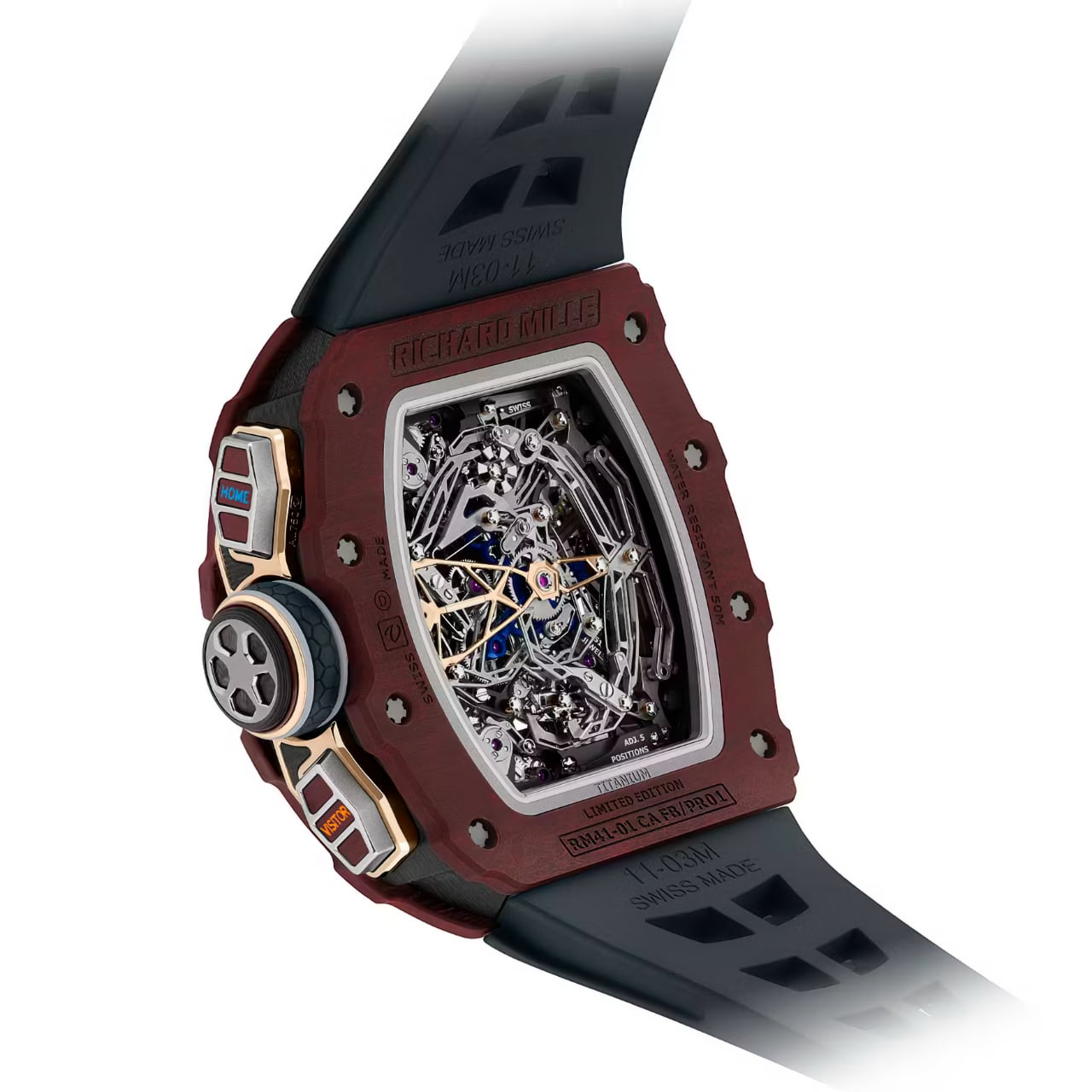 ตัวเรือนประกอบด้วยชิ้นส่วนสามชิ้นที่ประกอบด้วยชิ้นส่วนทั้งหมด 105 ชิ้น ปุ่มกดออกแบบให้มีร่องกันลื่นคล้ายกับคันเร่งรถแข่งและเม็ดมะยมทำจาก Titanium ล้อมด้วยขอบยาง Alcryn เพื่อการหยิบจับที่กระชับมือ ภายในขับเคลื่อนด้วยกลไกไขลานอัตโนมัติ Calibre RM41-01 ที่มีโครงสร้างจากวัสดุ Titanium Grande 5 ซึ่งประกอบขึ้นด้วยชิ้นส่วนภายในมากถึง 650 ชิ้น โดยมาพร้อมฟังก์ชัน Flyback Chronograph ที่ประกอบขึ้นด้วยกลไก Column Wheel ทำหน้าที่ควบคุมการจับเวลาได้อย่างแม่นยำ และสามารถรีเซ็ตเข็มจับเวลาได้ทันทีโดยไม่ต้องหยุดกลไก ทำงานด้วยความถี่ 21,600 ครั้งต่อชั่วโมง สำรองพลังงานได้นานประมาณ 70 ชั่วโมง นาฬิกามาพร้อมกับสายยางคุณภาพสูงพร้อมตัวล็อกแบบบานพับวัสดุ Titanium