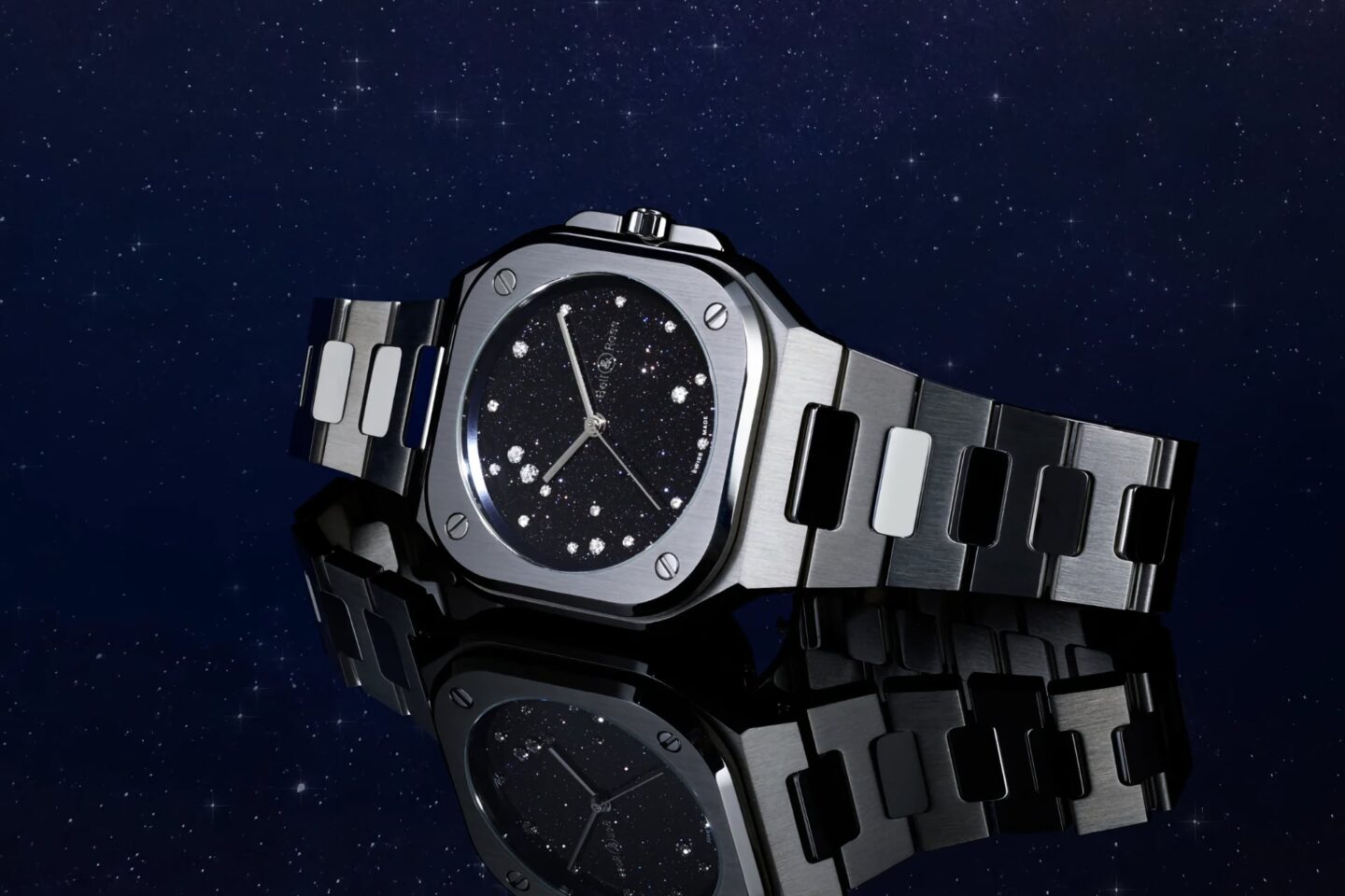 หน้าปัดของเรือนนี้มาในวัสดุ Aventurine Glass สีน้ำเงิน ที่มีคุณสมบัติระยิบระยับคล้ายดวงดาวบนท้องฟ้ายามค่ำคืน โดดเด่นด้วยการประดับเพชรเจียระไนแบบ Brilliant-cut ทำหน้าที่เป็นหลักชั่วโมง และมีความพิเศษอยู่ที่การจัดวางเพชรอีก 7 เม็ดที่มีขนาดแตกต่างกันเพื่อจำลองตำแหน่งของหมู่ดาวนกอินทรีหรือ Aquila Constellation โดยเฉพาะเพชรเม็ดใหญ่ที่สุด ณ ตำแหน่ง 10-11 นาฬิกา ที่สื่อถึงดาว Altair ซึ่งเป็นดาราที่สว่างที่สุดในกลุ่มดาวนี้ ตัวหน้าปัดมาพร้อมชุดเข็มทรง Skeleton เคลือบสารเรืองแสง Super-LumiNova เพื่อการอ่านค่าที่ชัดเจน ปกป้องหน้าปัดด้วยกระจก Sapphire เคลือบสารป้องกันการสะท้อน