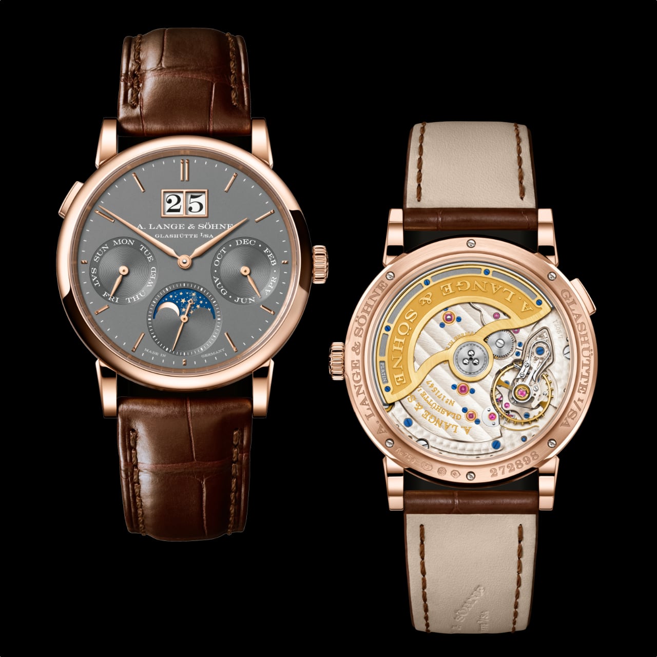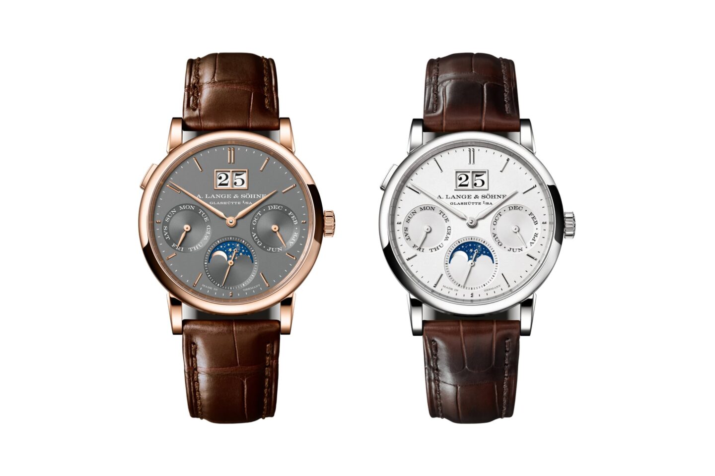 ตัวเรือนรุ่นใหม่นี้มีขนาด 36 มิลลิเมตร หนาพียง 9.8 มิลลิเมตร ผลิตจากวัสดุมีค่าอย่าง White Gold 18K และ Pink Gold 18K รูปทรงตัวเรือนเน้นความเพรียวบางสง่างามตามสไตล์นาฬิกาเดรส มาพร้อมปุ่มกดแบบปุ่มปรับตั้งอย่างรวดเร็ว ที่ตำแหน่ง 10 นาฬิกา สำหรับการเลื่อนฟังก์ชันปฏิทินทั้งหมดไปพร้อมกัน ขับเคลื่อนด้วยกลไกไขลานอัตโนมัติ Calibre L207.1 ทำงานด้วยความถี่ 21,600 ครั้งต่อชั่วโมง ให้พลังงานสำรองสูงถึง 60 ชั่วโมง โดดเด่นด้วยการขัดแต่งในระดับ High-end ตามมาตรฐานแซกซอน ไม่ว่าจะเป็น Balance cock ที่แกะสลักด้วยมืออย่างประณีต และชิ้นส่วนทองคำยึดทับทิมด้วยสกรู ปิดท้ายความสมบูรณ์แบบด้วยสายหนังจระเข้เย็บด้วยมือจับคู่กับหัวเข็มขัดแบบ Prong buckle วัสดุเดียวกับตัวเรือน