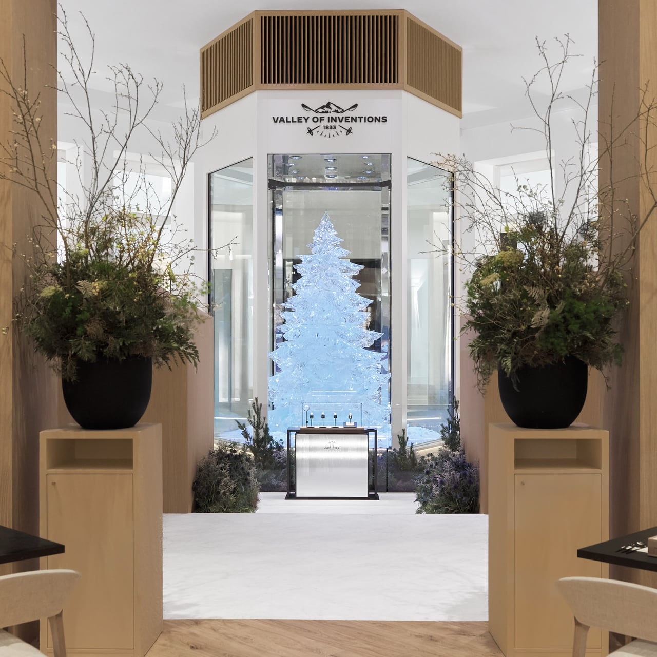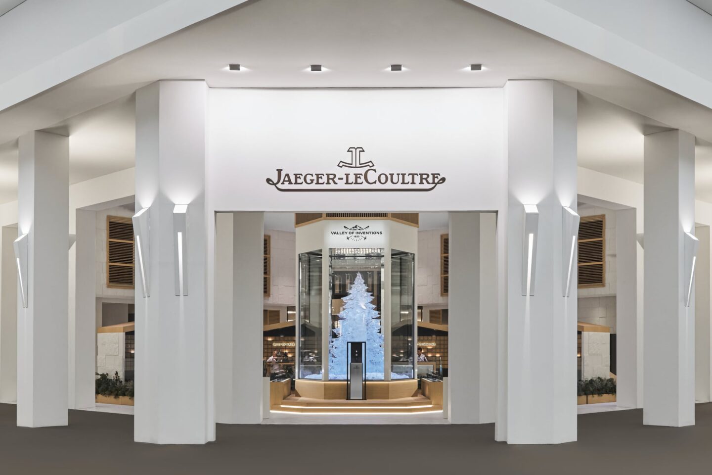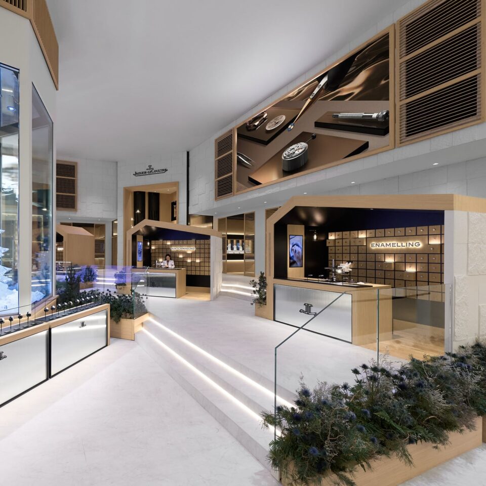 ในปีนี้ บูธของ Jaeger-LeCoultre ได้รับการออกแบบให้สะท้อนบรรยากาศฤดูหนาวของหุบเขา Vallée de Joux โดยมีจุดเด่นคือต้นสนที่สลักจากน้ำแข็งสูงเกือบ 4 เมตร สื่อถึงความเงียบสงบของธรรมชาติที่ตัดกับความอบอุ่นภายในโรงเวิร์กช็อป ซึ่งเป็นจุดกำเนิดของนวัตกรรมเครื่องบอกเวลา