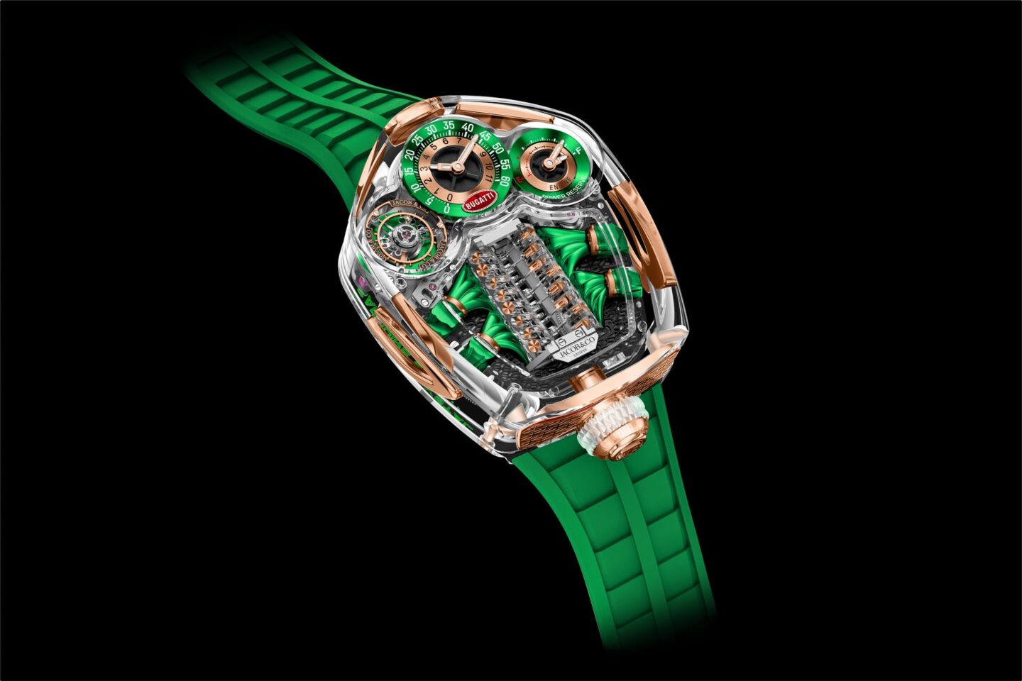 Jacob & Co. ตอกย้ำความสัมพันธ์อันแน่นแฟ้นกับค่ายรถยนต์ระดับโลกอย่าง Bugatti ด้วยการยกระดับคอลเลกชันที่ได้รับแรงบันดาลใจจากไฮเปอร์คาร์สู่จุดสูงสุด โดยหลังจากที่เคยเปิดตัวรุ่น Bugatti Tourbillon และรุ่นประดับอัญมณีอย่าง Baguette ไปก่อนหน้านี้ ครั้งนี้แบรนด์ได้นำวัสดุชั้นเลิศในวงการนาฬิกาอย่างผลึกแซฟไฟร์ มาสร้างสรรค์ตัวเรือนที่โปร่งใสทั้งหมด เพื่อเผยให้เห็นรายละเอียดอันซับซ้อนของกลไกจำลองเครื่องยนต์ V16 อย่างหมดเปลือกในทุกมุมมอง